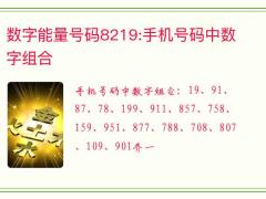 如果你的手机号码里有这些数字19、91、87、78、34、43、26、62:说明你是一个很有正事的人,通过你的能力你会有一个很好的职业,会严格要求自己,甚至能做到感情专一,或靠自己的能力争得荣誉