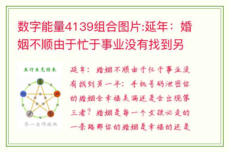 此文由 乔一数字能量学号码 编辑,未经允许不得转载!:首页 > 数字能量学 » 数字能量4139组合图片:延年:婚姻不顺由于忙于事业没有找到另一半