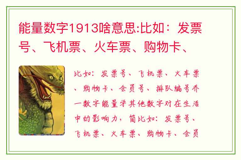 此文由 乔一数字能量学号码 编辑,未经允许不得转载!:首页 > 知识学习 » 能量数字1913啥意思:比如:发票号、飞机票、火车票、购物卡、会员号、排队编号